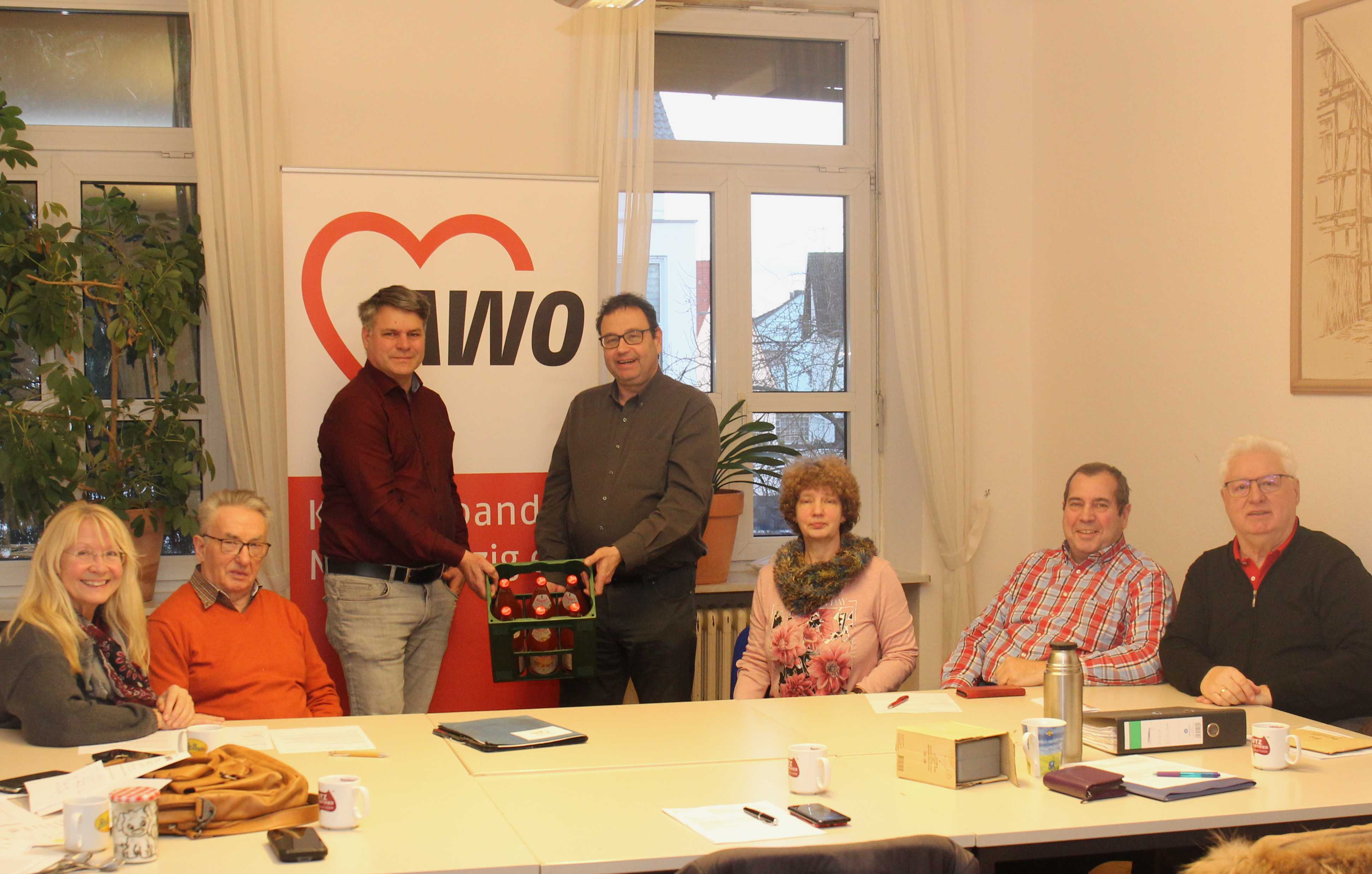 Im Gegenzug bedankte sich der Kreisvorsitzende Jörg Mair bei Alexander Ludwig als „Ideengeber bei den Zukunftswerkstätten“ mit einer Kiste Fruchtsäfte als „Vitaminstoß“ zum Beginn der neuen Aufgabe. Die Kreisvorstandsmitglieder hatten mit Alexander Ludwig einen fachlich versierten und sachlichen Unterstützer bei der Neufassung der Satzung der AWO im MKK!